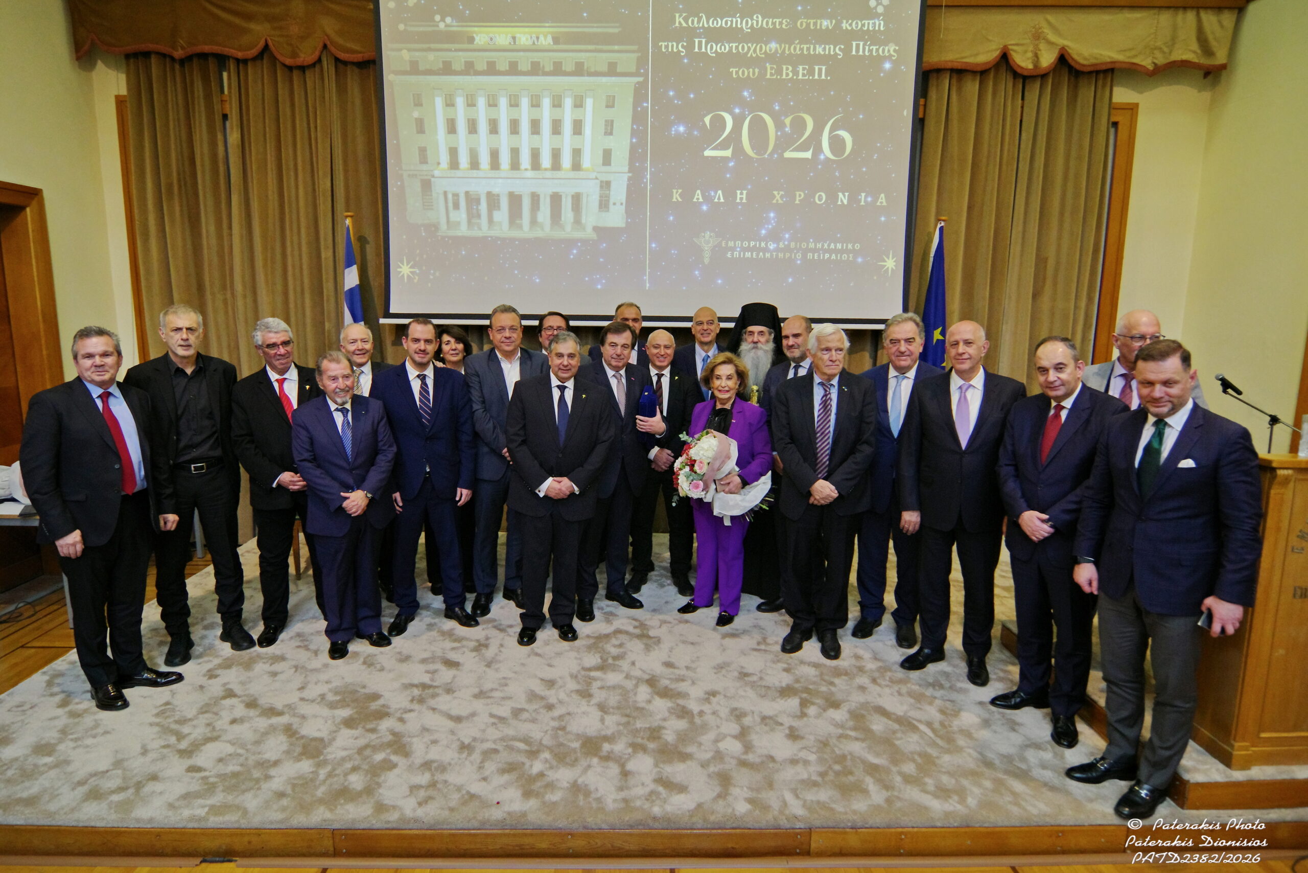 Με επιτυχία πραγματοποιήθηκε η εκδήλωση για την κοπή της πρωτοχρονιάτικης πίτας του Εμπορικού και Βιομηχανικού Επιμελητηρίου Πειραιώς (Ε.Β.Ε.Π.), παρουσία εκπροσώπων της κυβέρνησης, των κομμάτων της αντιπολίτευσης, της τοπικής αυτοδιοίκησης, των Σωμάτων Ασφαλείας και των παραγωγικών φορέων, αλλά και πρέσβεων. Τον αγιασμό τέλεσε ο Σεβασμιώτατος Μητροπολίτης Πειραιώς κ.κ. Σεραφείμ. Στο επίκεντρο της φετινής εκδήλωσης βρέθηκε με ομόφωνη απόφαση του Δ.Σ., η αναγόρευση σε επίτιμα μέλη: